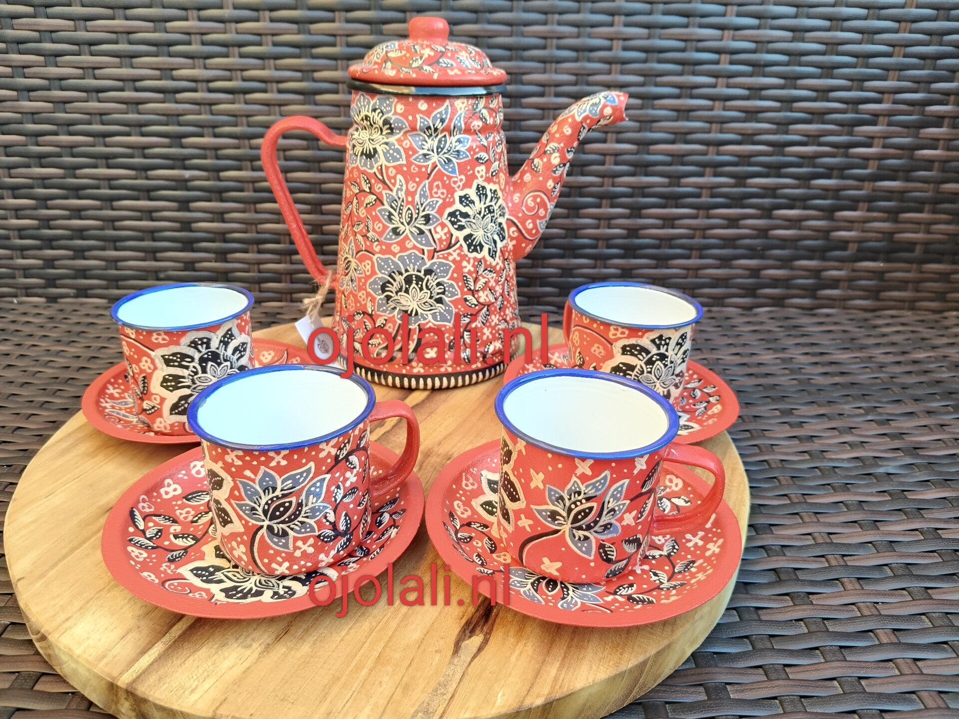 Satu set berisi 1 buah teko set, 4 cangkir tanpa tutup, 4 tatakan.